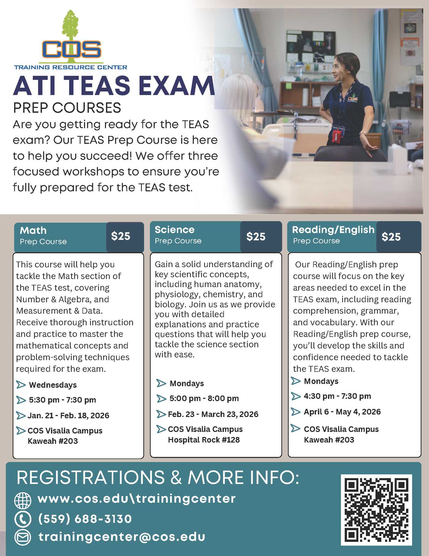 College of the Sequoias requires a minimum score of 62% on the ATI TEAS. Applicants must achieve this score in their first two attempts at the ATI TEAS. If the applicant does not achieve this minimum score in their first two attempts, they will not be considered for the COS Nursing Program. A minimum of 45 days between exams is required.